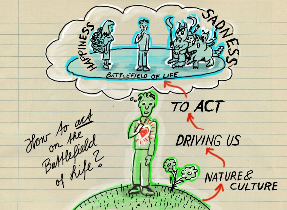 In the Bhagavad Gita the activity in our mind is modeled using the metaphor of the “battlefield of our life”. One army represents all the worries about the future, painful feelings and bad experiences. The other, much smaller army, stands for serenity, happiness. In our life we often stand between these two armies. Depending on our nature we might freeze, run away or get aggressive. It’s not wrong to react according to ones nature. But will such a reaction really help to win – in the long run – the battle against the army of negative thoughts?