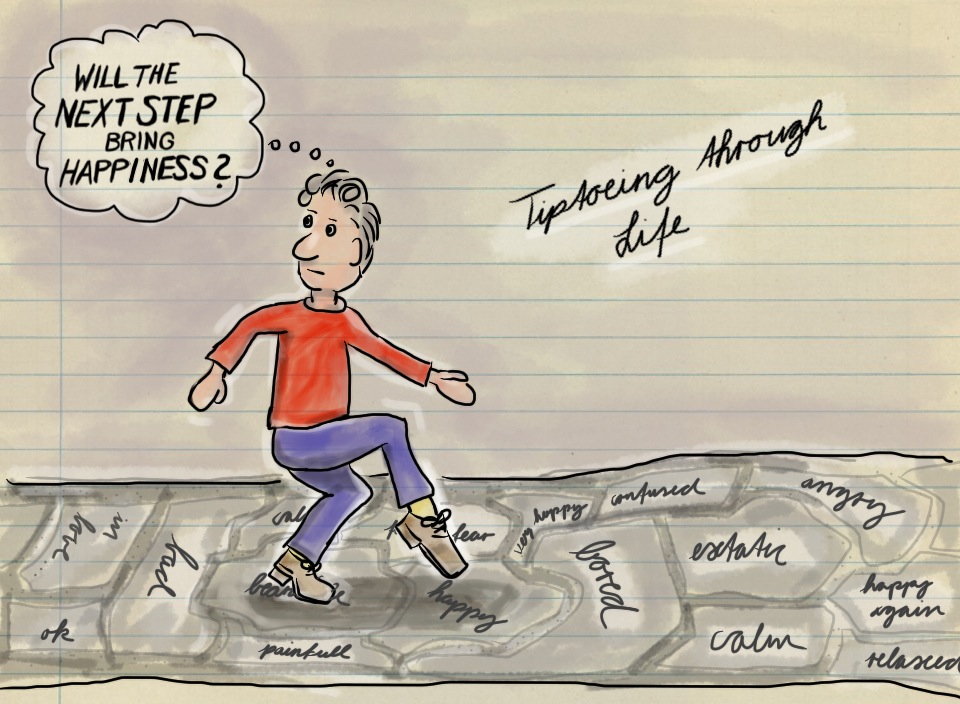 The drawing above represents the moment the battle starts. A moment on the journey of life, hesitating to take the next step. Looking back, remembering past experiences, constructing possible scenarios about the future, desperately trying to find an answer which feels right. Our ego telling us in which direction to walk: “Go for the career, MONEY! Step on this stone, the one which FEELS nice, makes you look good in front of others!” One day we arrive at a point, where our ego seems like a bad guide. We would like to start something new, do something which makes us happy. At the same time we don’t want to give up everything we built up over the years. The situation seems so complicated. We hesitate. Can’t decide on our next step.