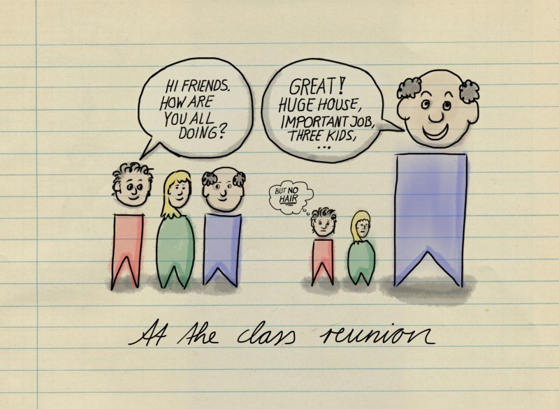 Everyone is looking forward to meet old friends. Mostly, because it allows us to compare our lives, know where we stand, what we achieved. We all started at the same school, probably came from similar social backgrounds. Believing in the idea of “merit” is believing that you had the same opportunities in life as your class mates. Optimal conditions for compulsive envy, for anxiety.