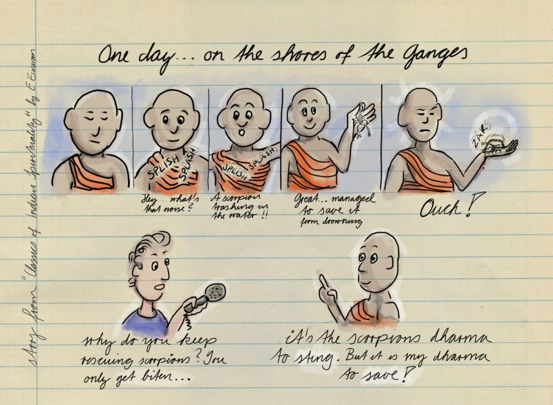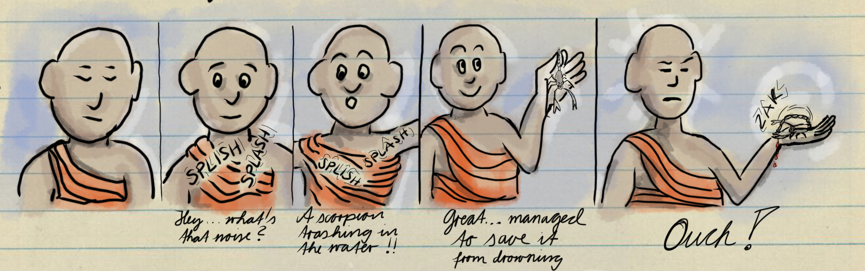 In his interpretation of the Bhagavad Gita, E. Eswaran uses the following story to explain the concept of dharma: A sage, living on the shores of river Ganges, notices a scorpion has fallen into the water. He reaches down, rescues it, only to be stung. A bystander, observing this, exclaims: “Holy sage. Why are you doing this? Don’t you see, that this wretched creature will only sting you in return? “ “Of course,” the sage replied. “It is the scorpion’s dharma to sting. But it is the dharma of a human being to save.”