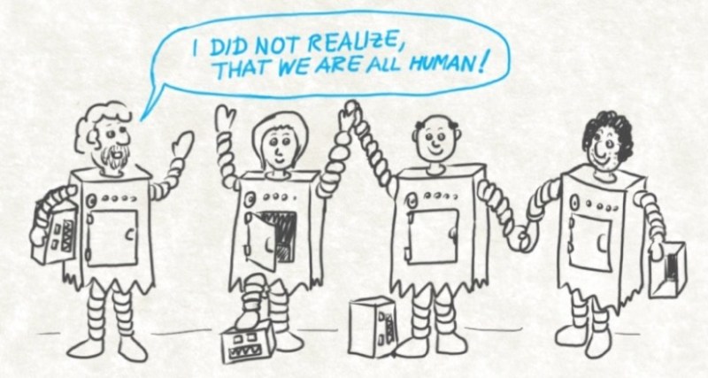 The easiest thing to do when surrounded by robots is to desguise yourself as a robot. I once worked in a company I did not fit in at all. After a couple of weeks my wife and a couple of honest friends remarked: “What is happening to you? It seems that you are turing into a robot.” Shortly afterwards I decided to quit. To my surprise my colleagues at work congratulated me for my decision. They did not like the work environment either and told me: “I am only doing this for 2-3 years in order to advance my career.” Staying took more courage than leaving. Living in robot country is hard. We just should be aware that putting on the robot disguise is easier than taking it off.