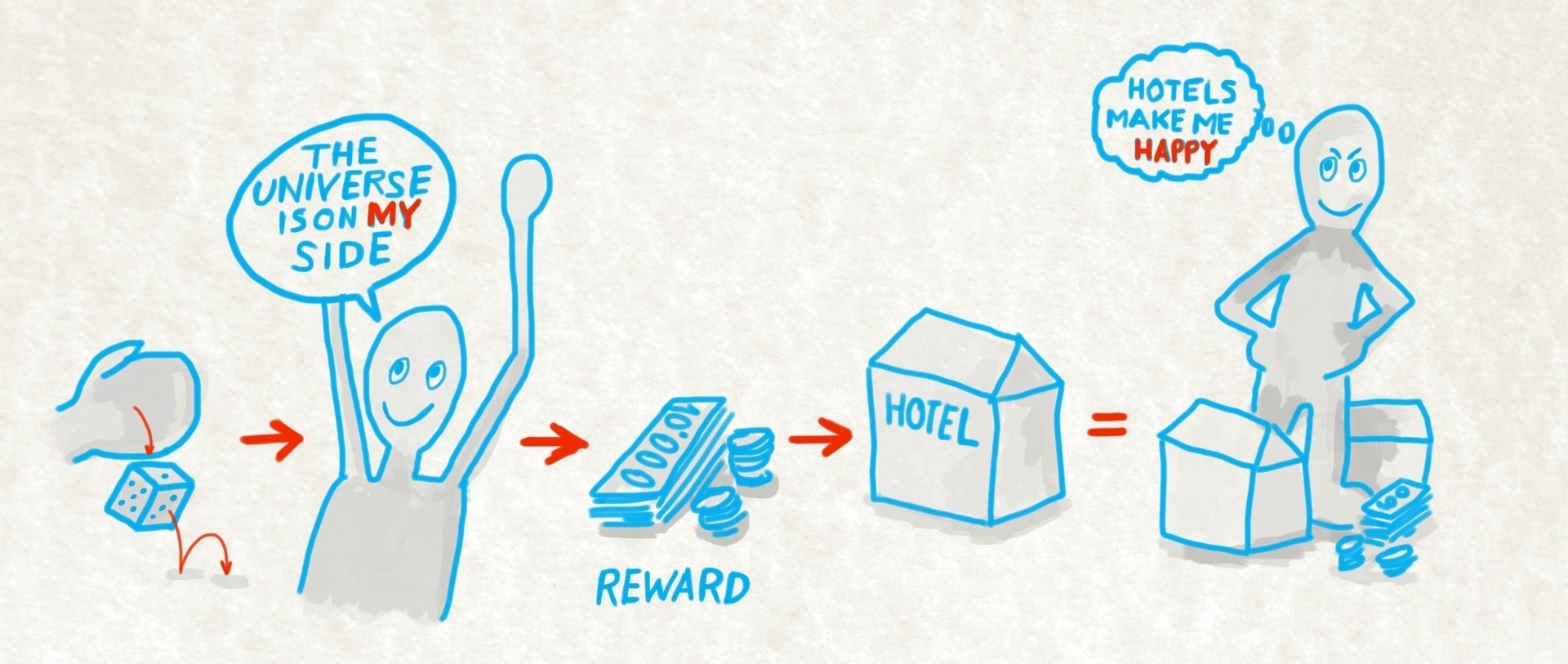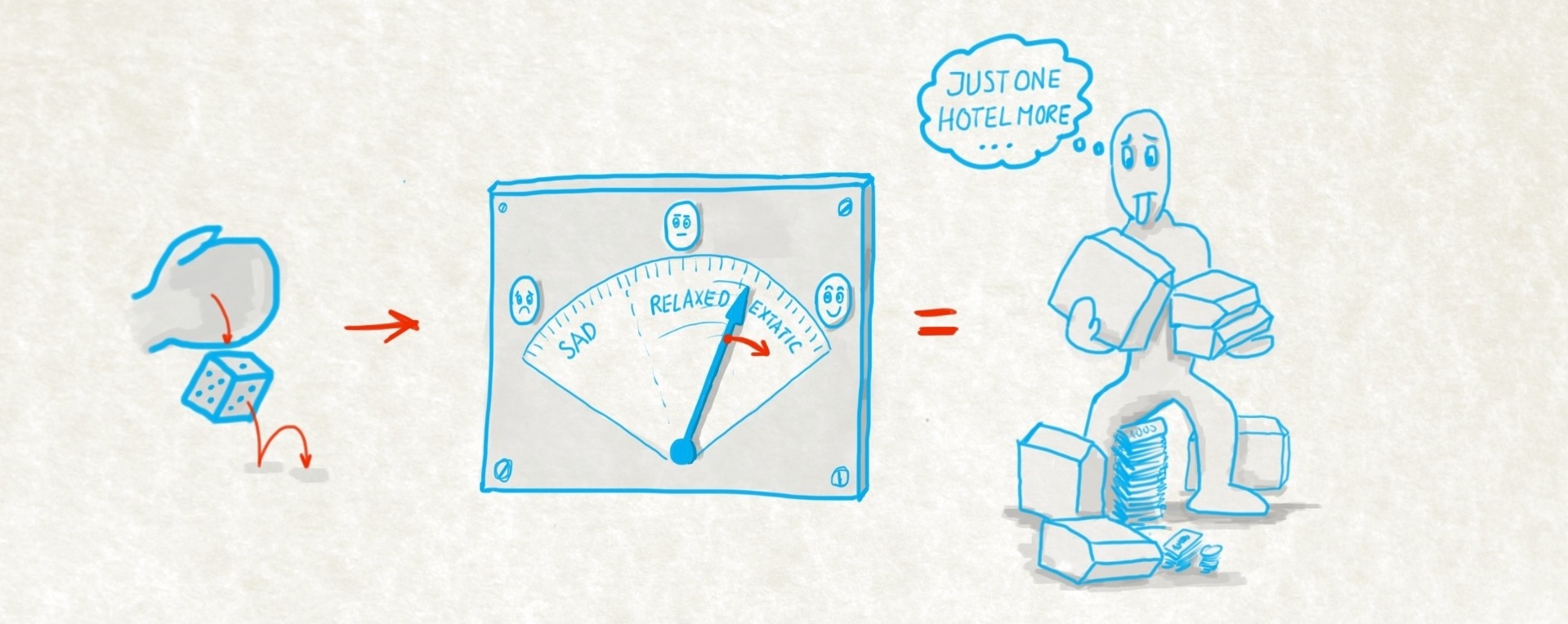 What we forget is, that the wonderful emotion after a lucky dice roll is short lived. We pretty soon need another dice roll to feel sensational again. Waiting for our next turn starts to feel like eternity. And because owning as much property as possible increases our chances to feel good, we become attached to our hotels.