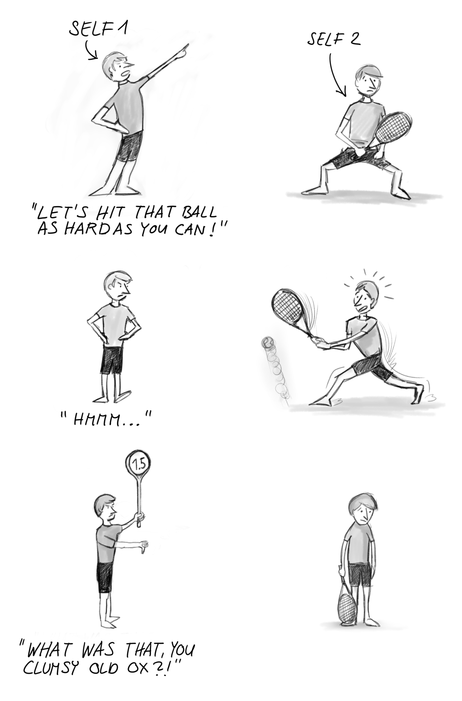 It might be true that at work we don’t run around like tennis players on a tennis court. We develop software systems after all. But we need our fingers to type on our keyboards, our eyes to read what we’re writing, our mouth to voice what we think and our ears to listen to feedback. It’s still a connection from the rational mind to our body, a conversation between self1 and self2. If our conscious energy is stuck somewhere in the past or future, we will not be there to act in the present.
