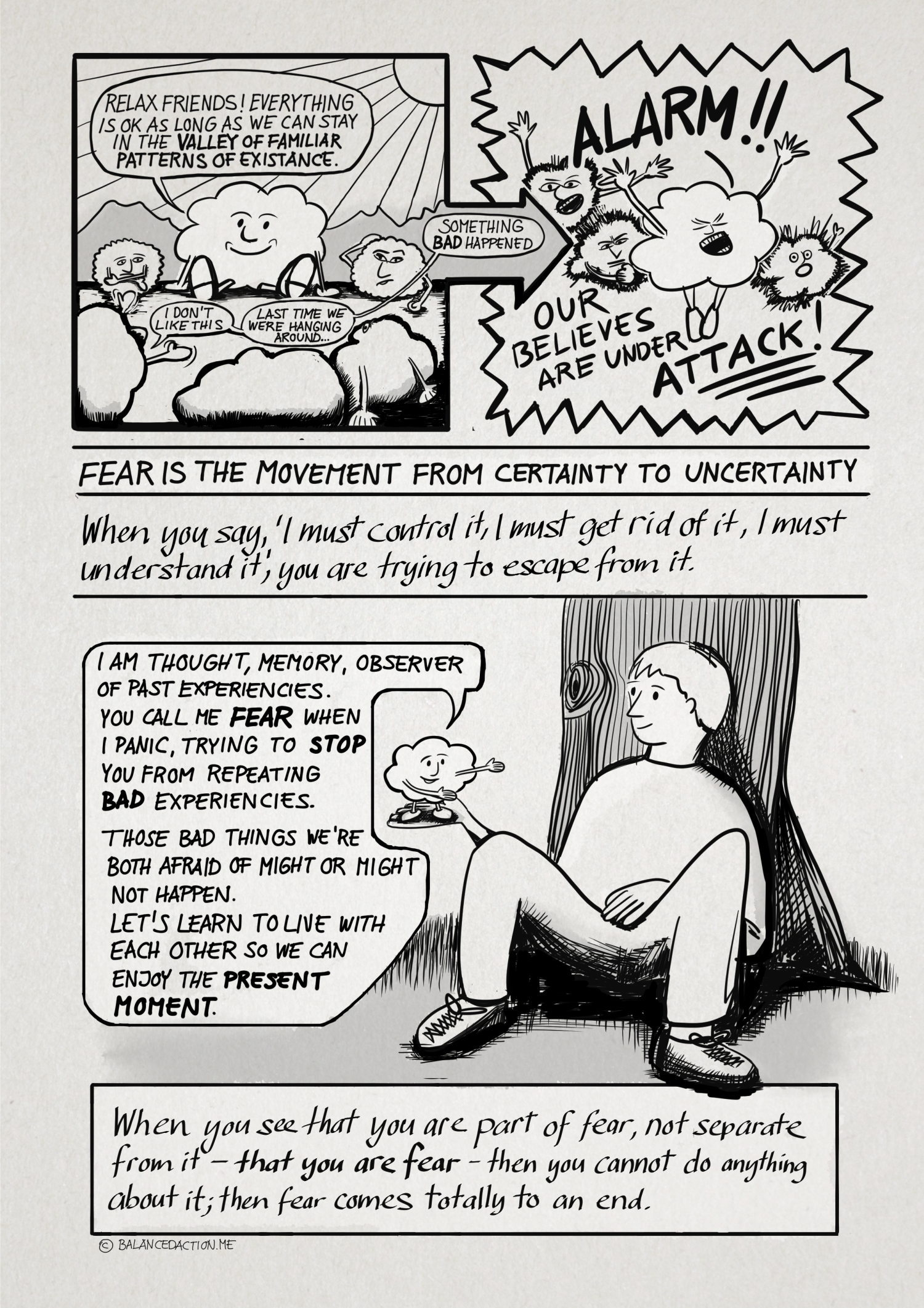 The only way to end fear is to realize that fear is part of us and we are part of fear. Fear disappears, if we manage to truly look it in the eye, understanding that fear itself is insubstantial. It’s what fear is pointing to, that we’re afraid of.