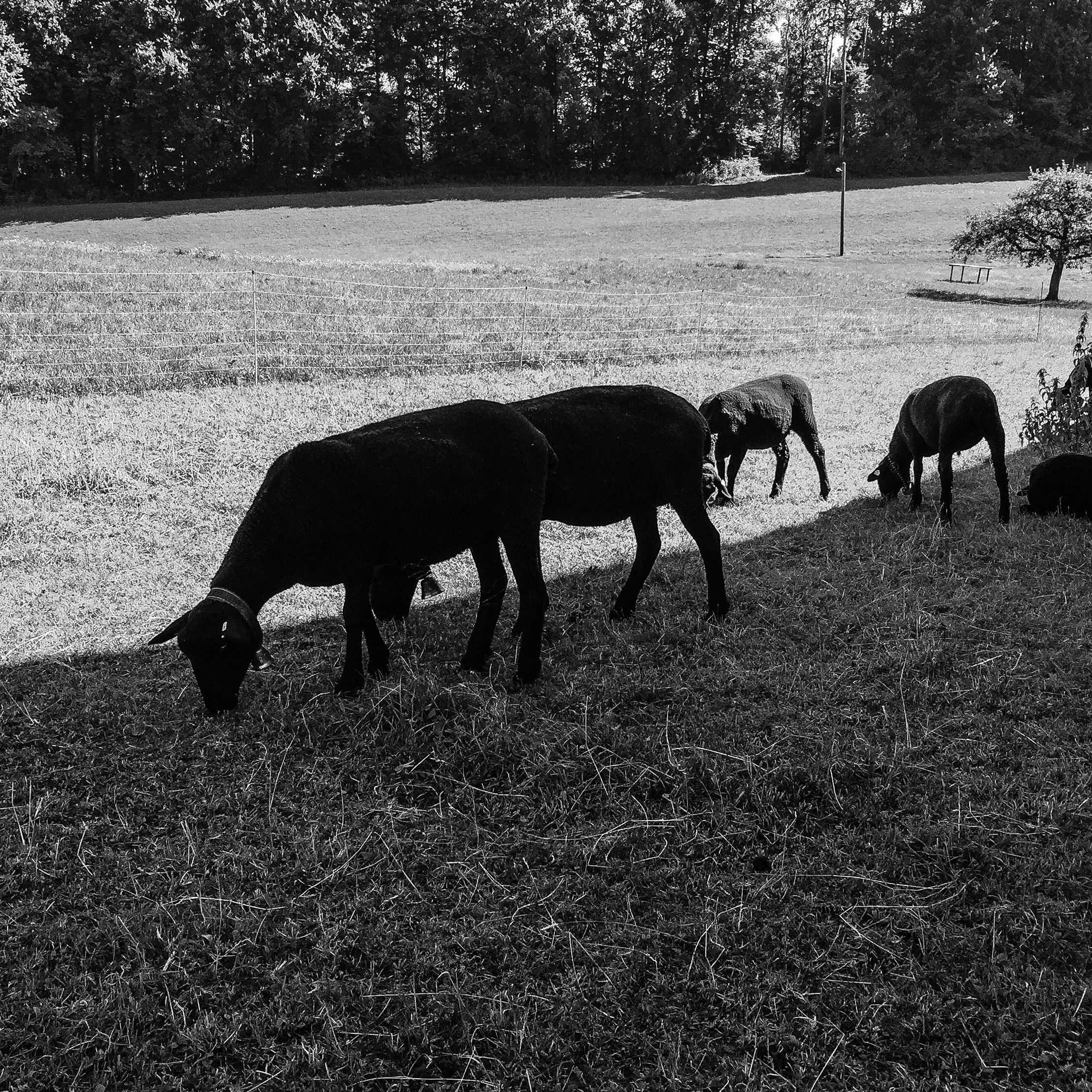 Further up the hill, past the old barn, some sheep were grazing in the shadow.