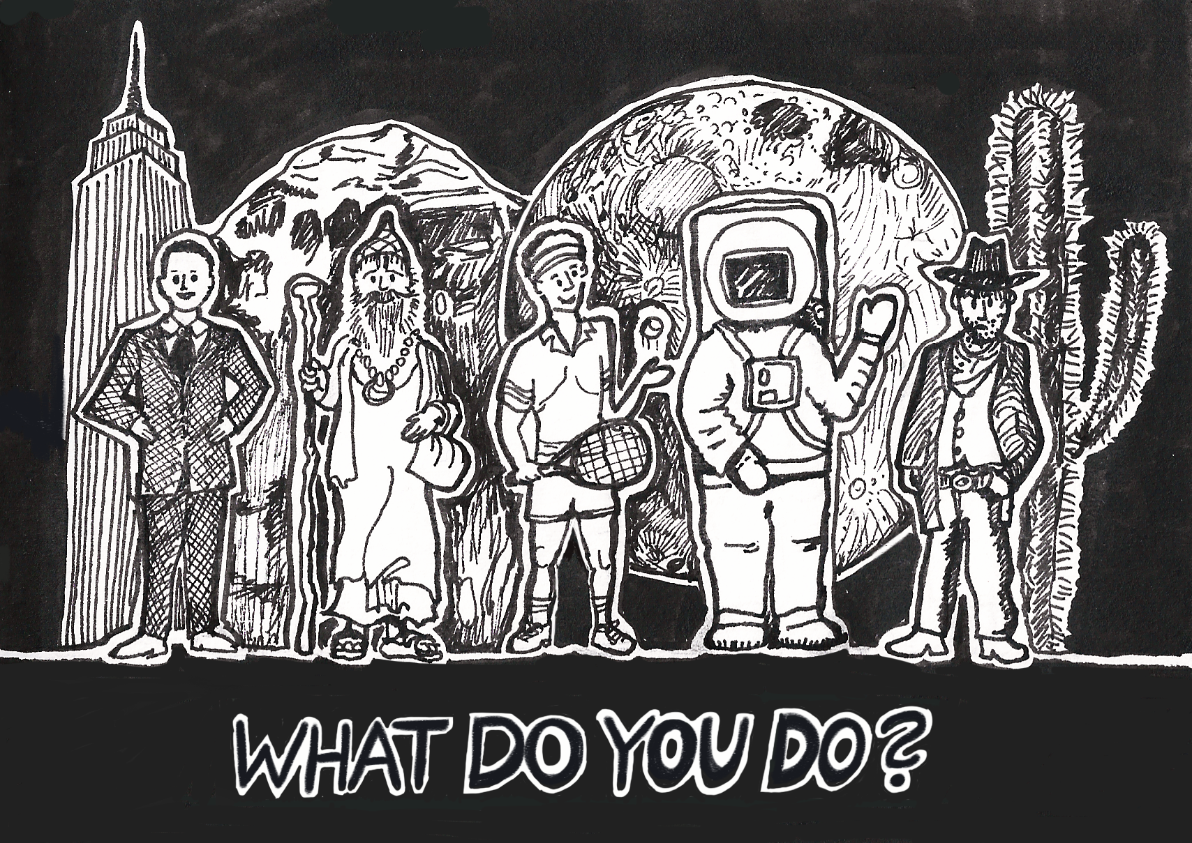 I believe the first step to happier work is to explore, how we feel about different jobs. This is what this week’s sketch is about. Let’s have a look. Who would you like to meet? The successful lawyer, the Indian yogi, the world class tennis player, the astronaut or the cowboy?