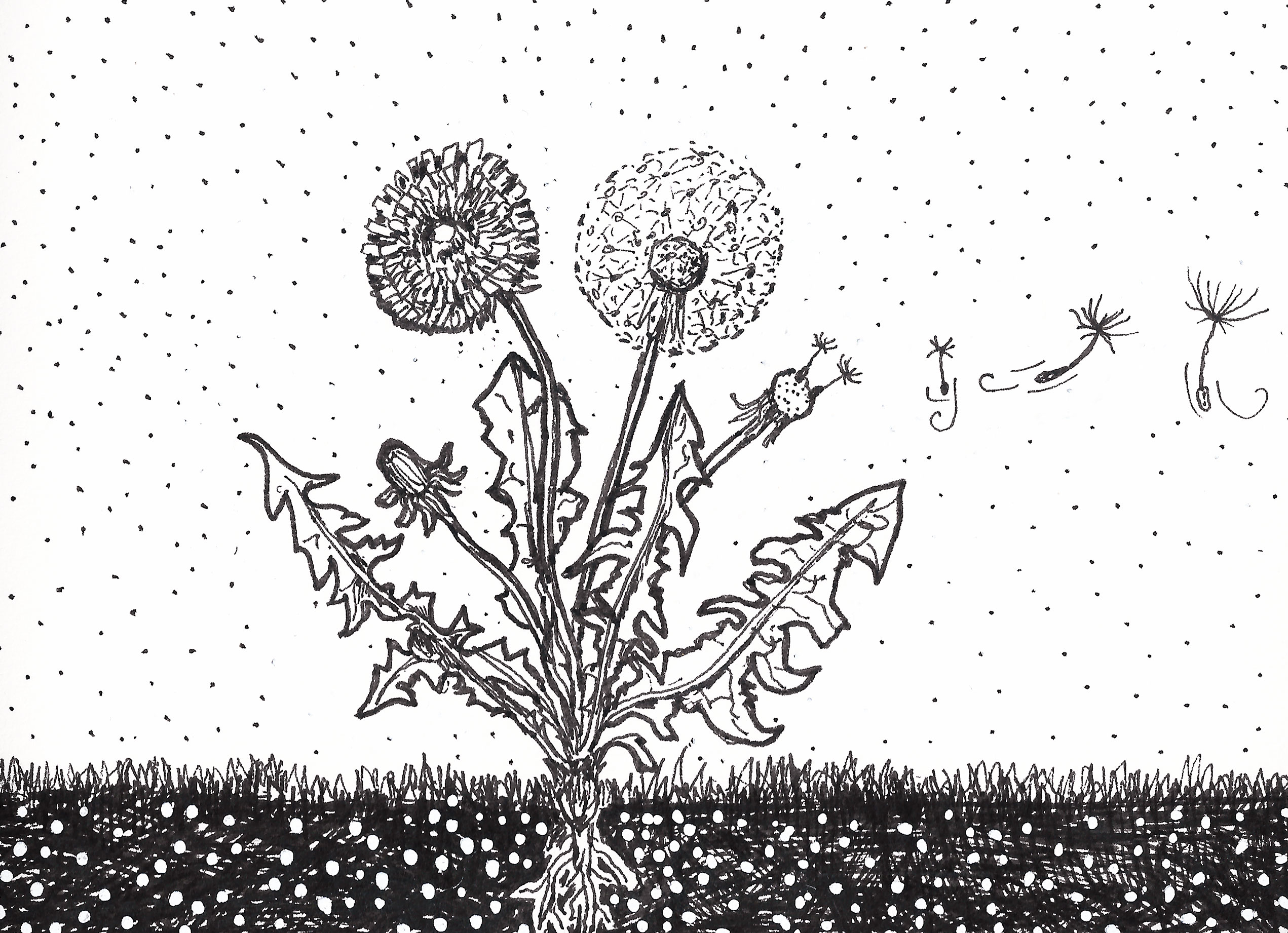 Last week’s sketch showed a parachuter slowly gliding towards earth, symbolising the idea that our life starts when we’re born and ends when we die. With this sketch of a Dandelion plant I would like to invite you to look at life as something beyond conscious thought.